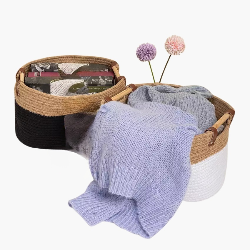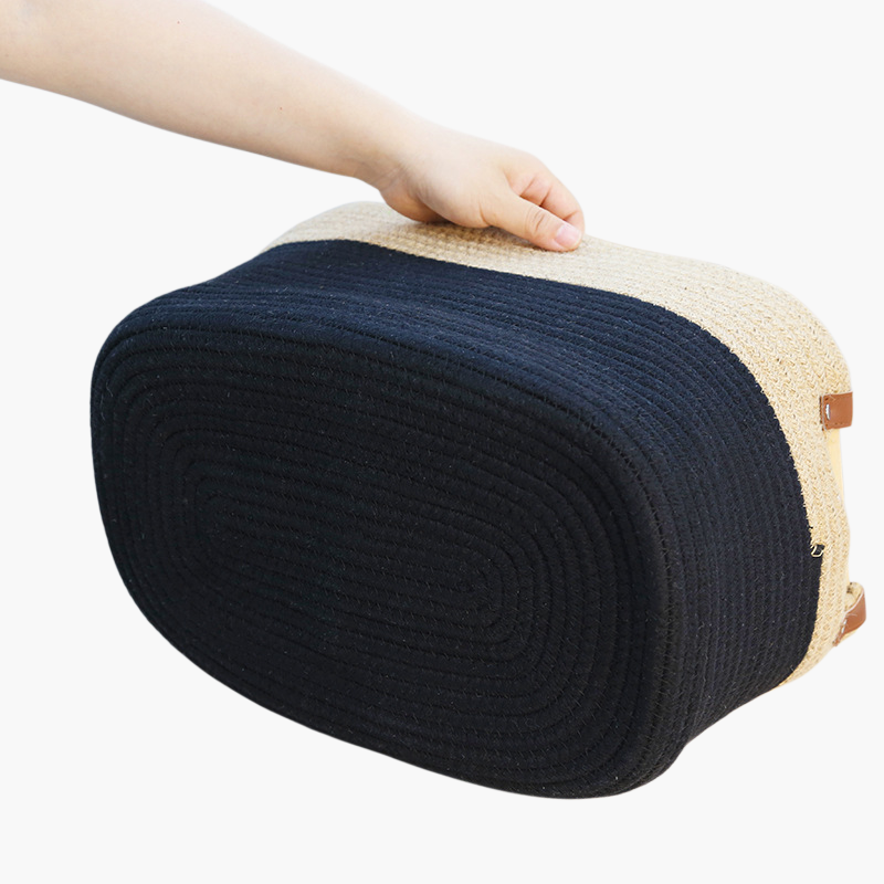 シンプルな編み込み収納バスケットは、省スペース設計で整理整頓に最適。耐久性が高く、様々な場所で使える収納アイテムです。